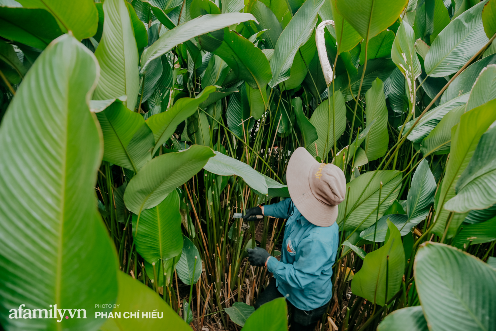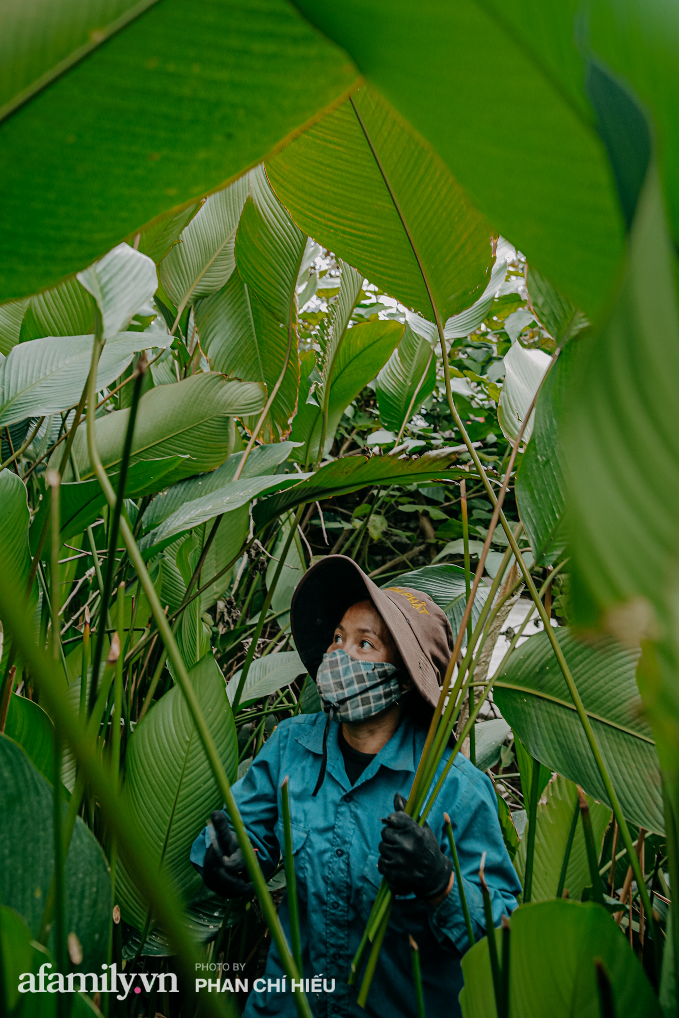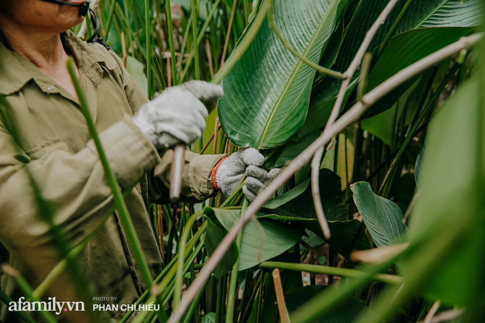 Là một người làm công việc cắt lá được chủ vườn thuê thu hoạch, mỗi ngày chị Liễu bắt đầu công việc từ sáng sớm đến cuối giờ chiều, chị sẽ phải mặc trang phục áo dài, bịt kín để tránh bị ngứa, khi thu hoạch liên tục phải nhìn lên cao để chọn lựa những loại lá đẹp và đều nhất, phần cuống cũng sẽ được cắt dài khoảng 1 mét để lá có thể tươi được khoảng nửa tháng sau khi thu hoạch.