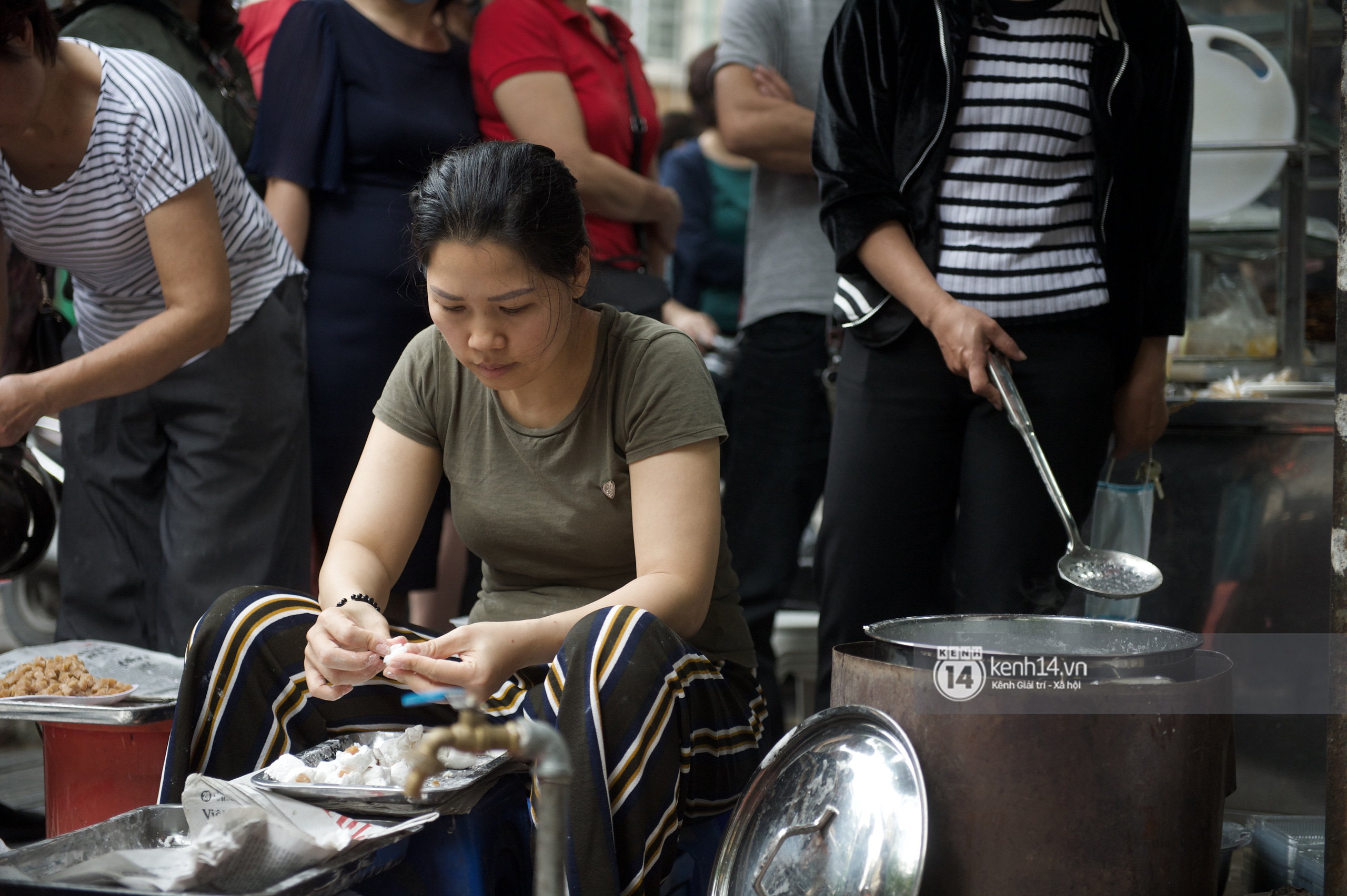 Sáng nay (3/3 âm lịch), không nằm ngoài dự đoán, mới từ khoảng 7h - 8h sáng mà các lượt khách đến xếp hàng mua cực đông. Để có thể có đủ bánh bán, quán chè này cũng sắp xếp "đội ngũ" làm bánh ngay "tại trận". Người nặn bánh luôn tay, người luộc bánh rồi vớt bánh liên tục, khách hàng cũng ra vào nườm nượp.
