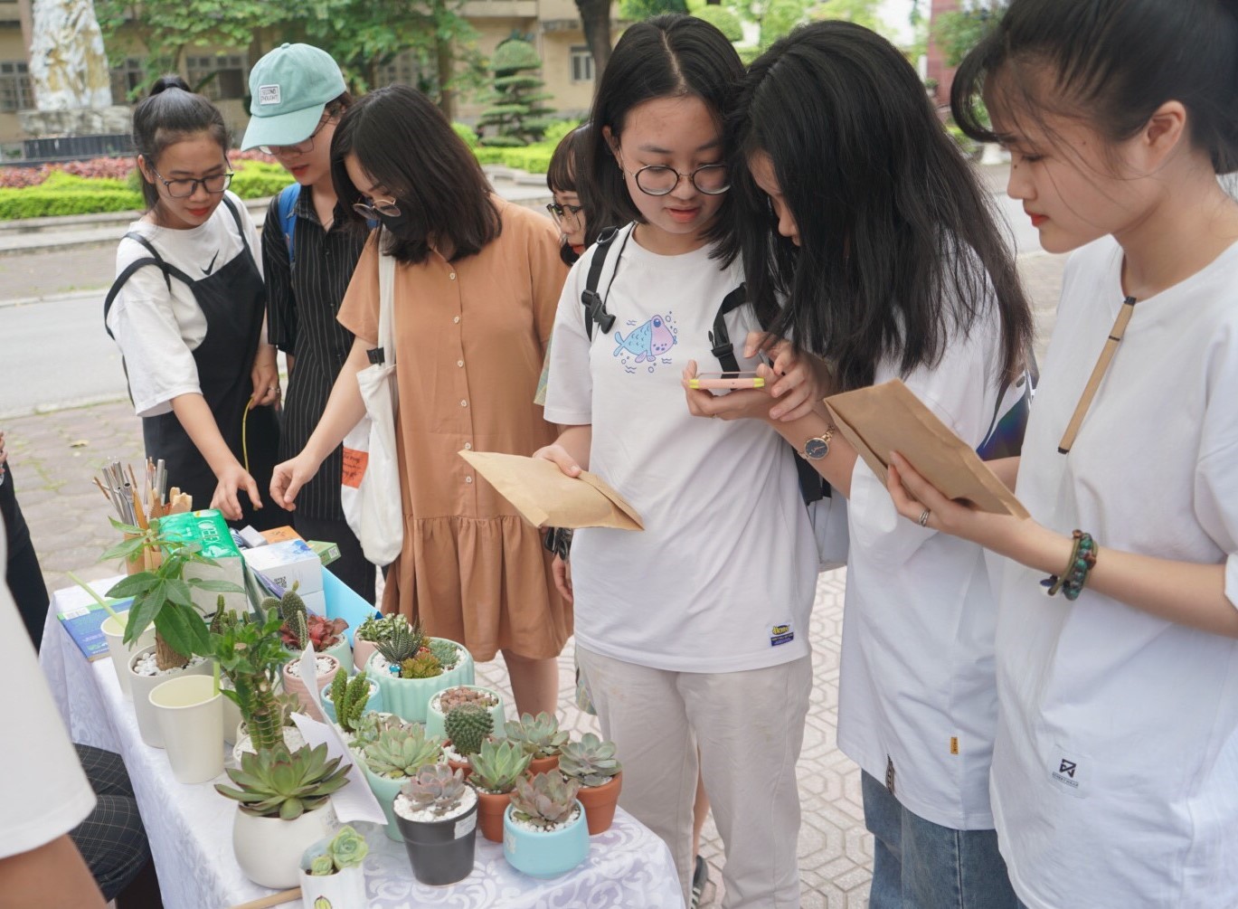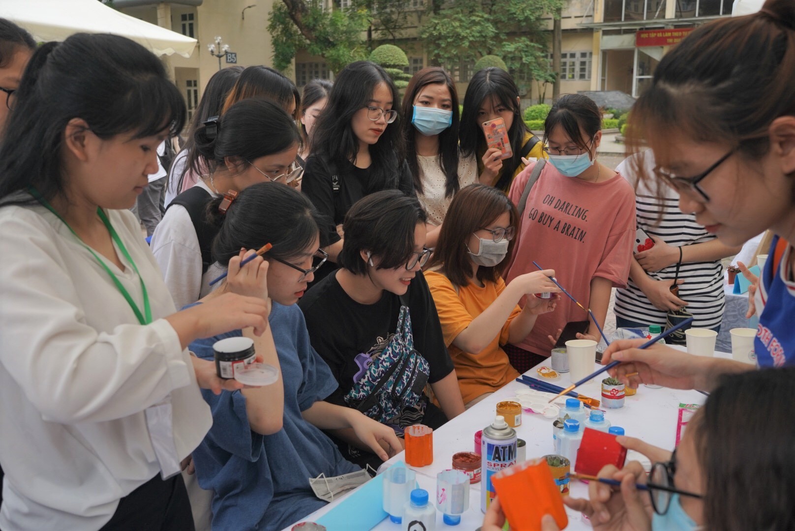 Các bạn sinh viên hào hứng tham gia trải nghiệm tô màu cho những chậu cây được tặng
