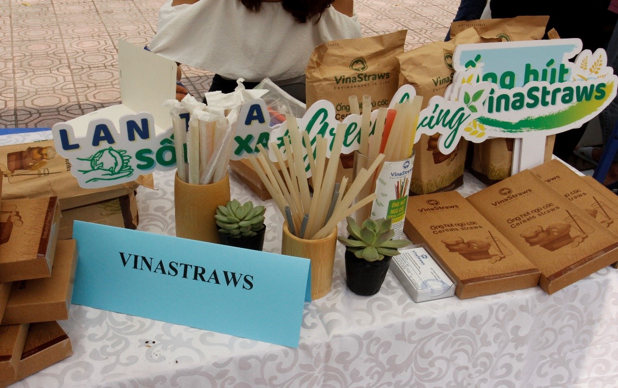 Gian hàng ống hút được làm từ gạo, bột sắn,...hoàn toàn thân thiện với môi trường, có thể ăn được và không bị biến dạng trong nhiều giờ