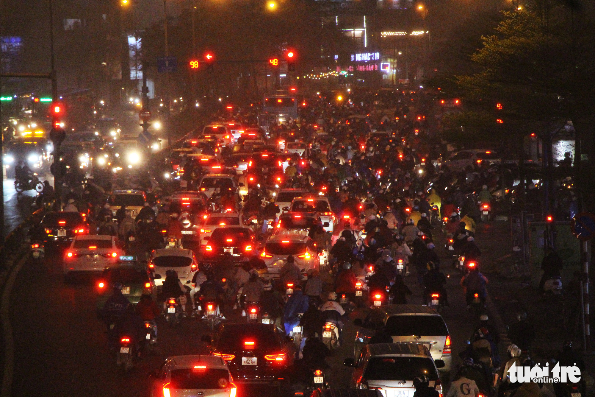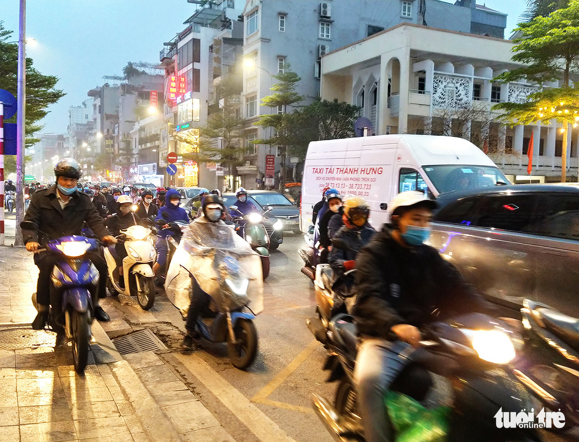Theo ghi nhận của Tuổi Trẻ Online, cơn mưa phùn dai dẳng bắt đầu từ cuối giờ chiều đã khiến việc đi lại tại một số khu vực của TP Hà Nội khó khăn.