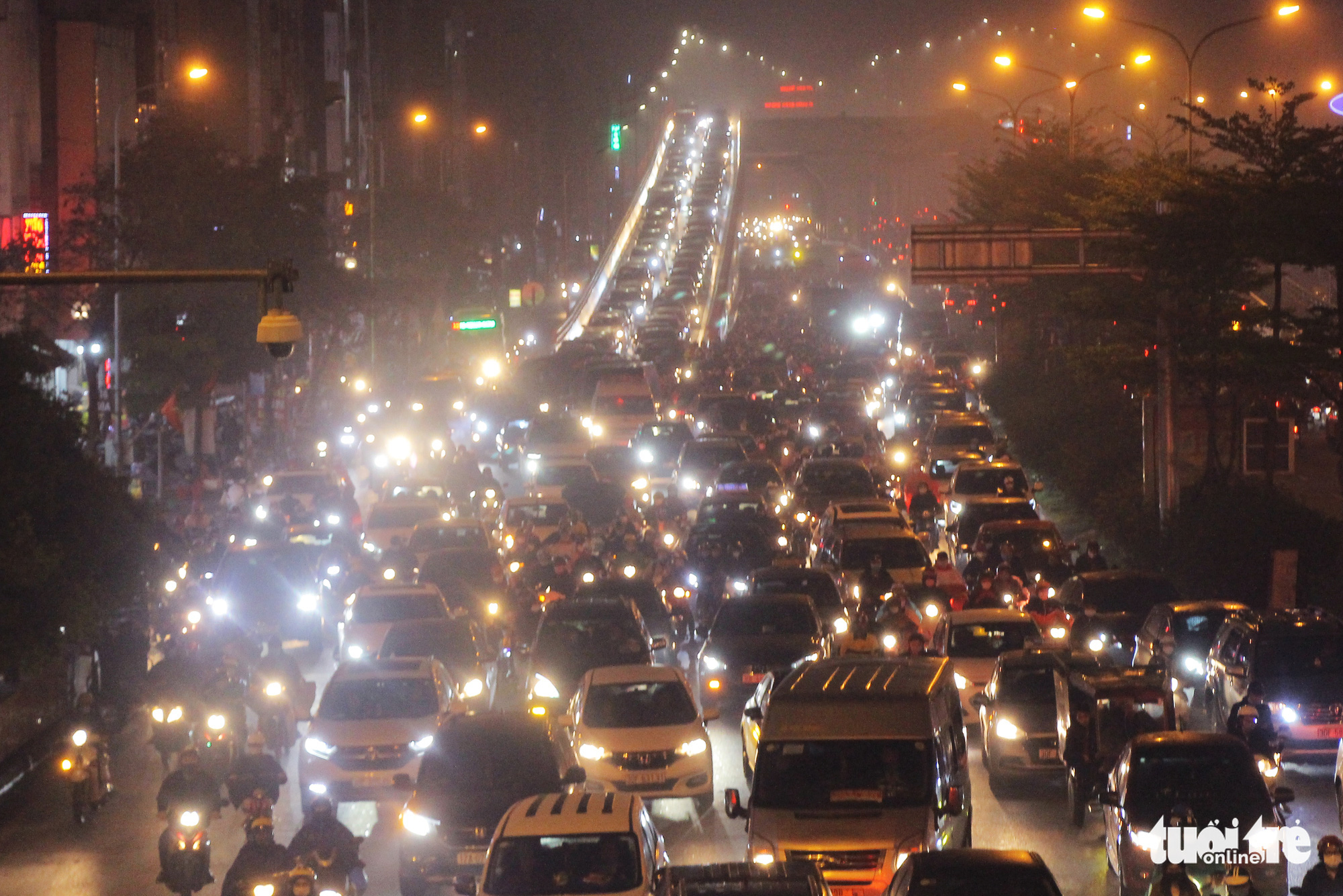 Nhiều ôtô nối đuôi nhau lên cầu Thái Hà chiều 5-3 - Ảnh: H.Q.