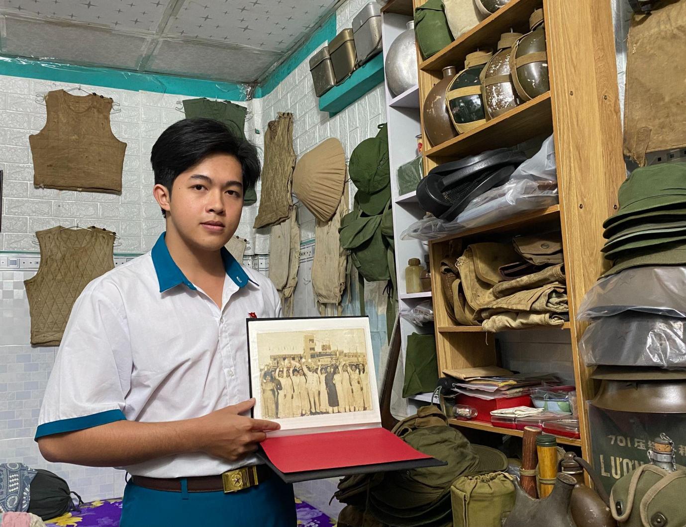 Không chỉ dừng lại ở việc lưu giữ tại nhà, Hào còn tham gia các hoạt động trưng bày chuyên đề, trực tiếp giới thiệu hiện vật đến học sinh và người dân. Trong nhiều dịp, em khoác lên mình những bộ quân phục xưa, đóng vai trò như một "hiện vật sống", giúp người xem hình dung rõ hơn về từng giai đoạn lịch sử, giúp lịch sử trở nên gần gũi hơn, đặc biệt với các bạn trẻ.
